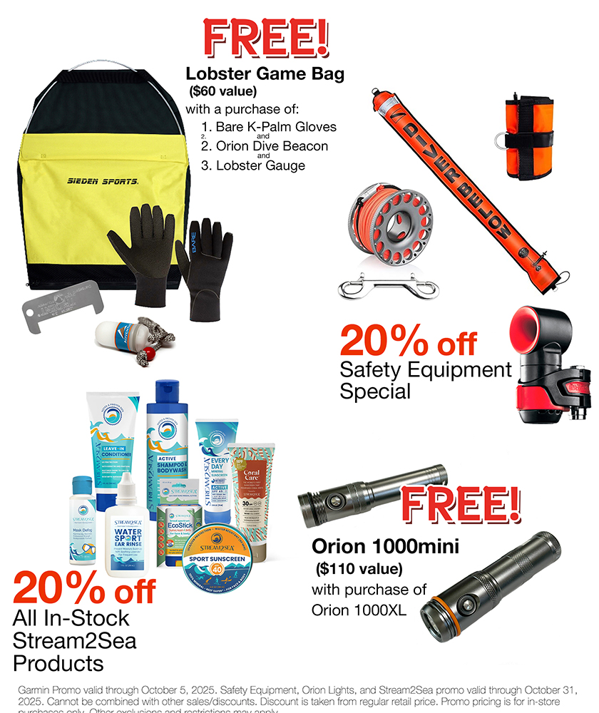 FREE Lobster game bag* with purchase of Bare K-Palm Gloves, Orion DIve Beacon, and lobster gauge