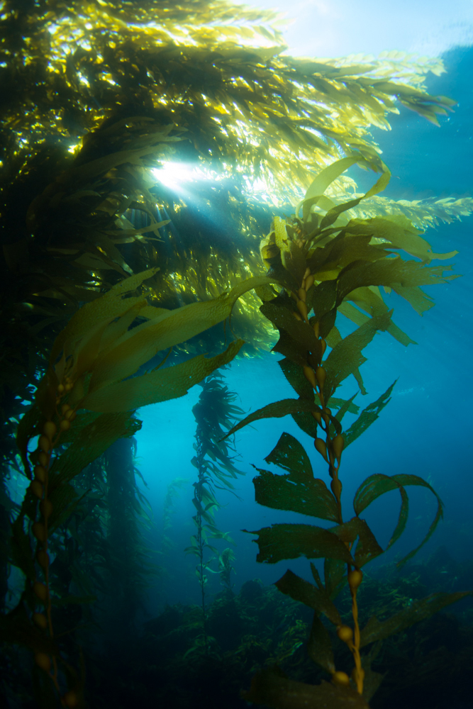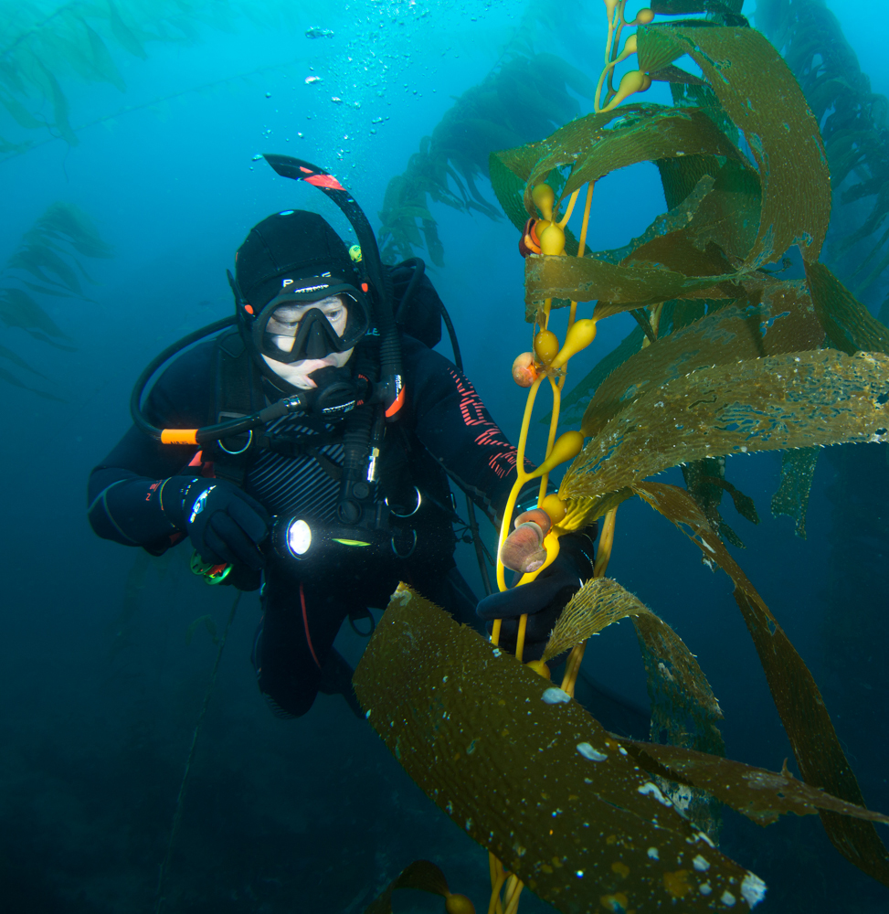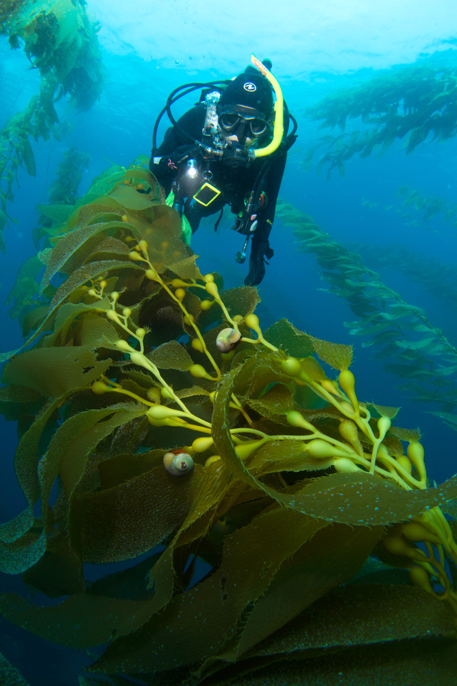 Norris’ top snail (Norrisia norrisii) is a medium sized marine snail commonly found from Point Conception to Baja California, Mexico. You can see several on the giant kelp in this image. These snails work hard… they climb up to graze on the giant kelp, and then they drop down to the sea floor to sleep at night. Next time you swim through a kelp forest, try looking for them.