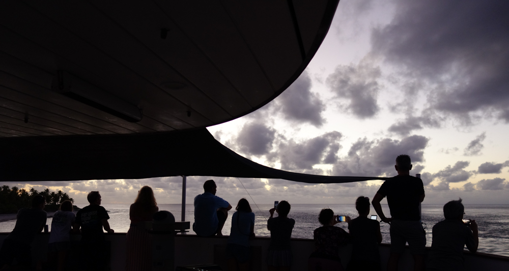 A group of divers enjoying a quiet moment watching the sunset in French Polynesia. Everyone was waiting to see the green flash, but only three saw the fleeting moment. It is a simple and precious moment that is easily overlooked in our busy city life. A liveaboard trip offers the time to relax and enjoy such a moment.