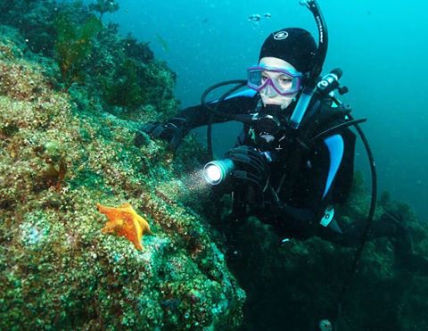 Here is one of our new divers admiring a bright orange bat star at Santa Cruz Island. Visibility is often low during the summer months, but this does not mean the dive is any less fun. All you have to do is to take a closer look at the reef. You will spot countless creatures on and around the reef or sandy floors.