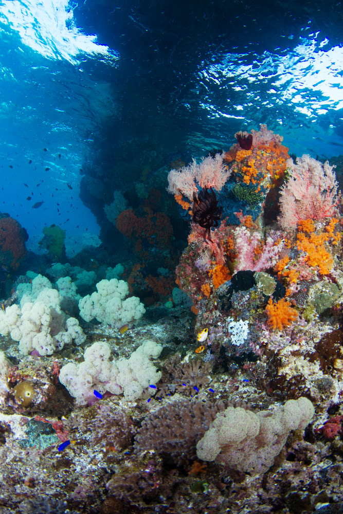 Seamount and reef covered with colorful soft coral and sponges in clear blue water. This is a good example of what a diver sees at Raja Ampat, Indonesia. This remote area is underwater photographer’s heaven. The wide-angle photographers enjoy the colorful reef and large schools of fish while the abundance of small creatures keep the macro photographers busy. Of course you don’t have to be a photographer to enjoy Raja Ampat. The view is stunning and diving is very dynamic.